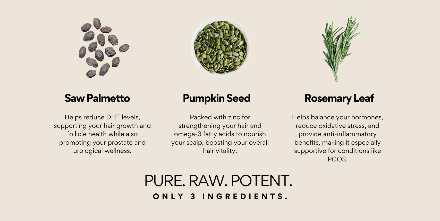 A pure, raw, and potent formula with just three powerful plant-based ingredients. No fillers. No chemicals. Just full-strength, concentrated nutrients that actually make a difference!